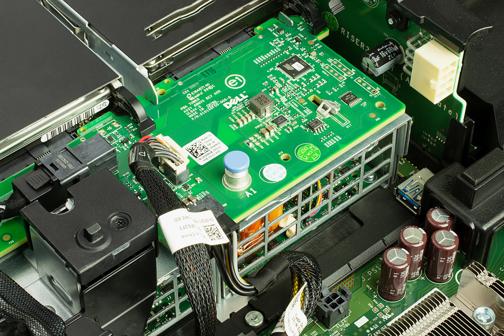 Diskový řadič pro disky s rozhraním SAS / SATA Diskový řadič v serveru umožňuje vytvářet úložiště pro data nad více fyzickými disky. S jeho pomocí lze nakonfigurovat různá RAID pole (např. RAID 0, RAID 1, RAID 5, RAID 6, ...), která kombinují disky pro vyšší výkon, větší kapacitu a zajištění datové redundance. Cache paměť na řadiči urychluje operace čtení a zápisu tím, že dočasně ukládá data. Baterie (BBU) chrání cache obsah při výpadku napájení, čímž zajišťuje, že se důležitá data neztratí. K diskovým řadičům SAS SATA nelze připojit NVMe disky.